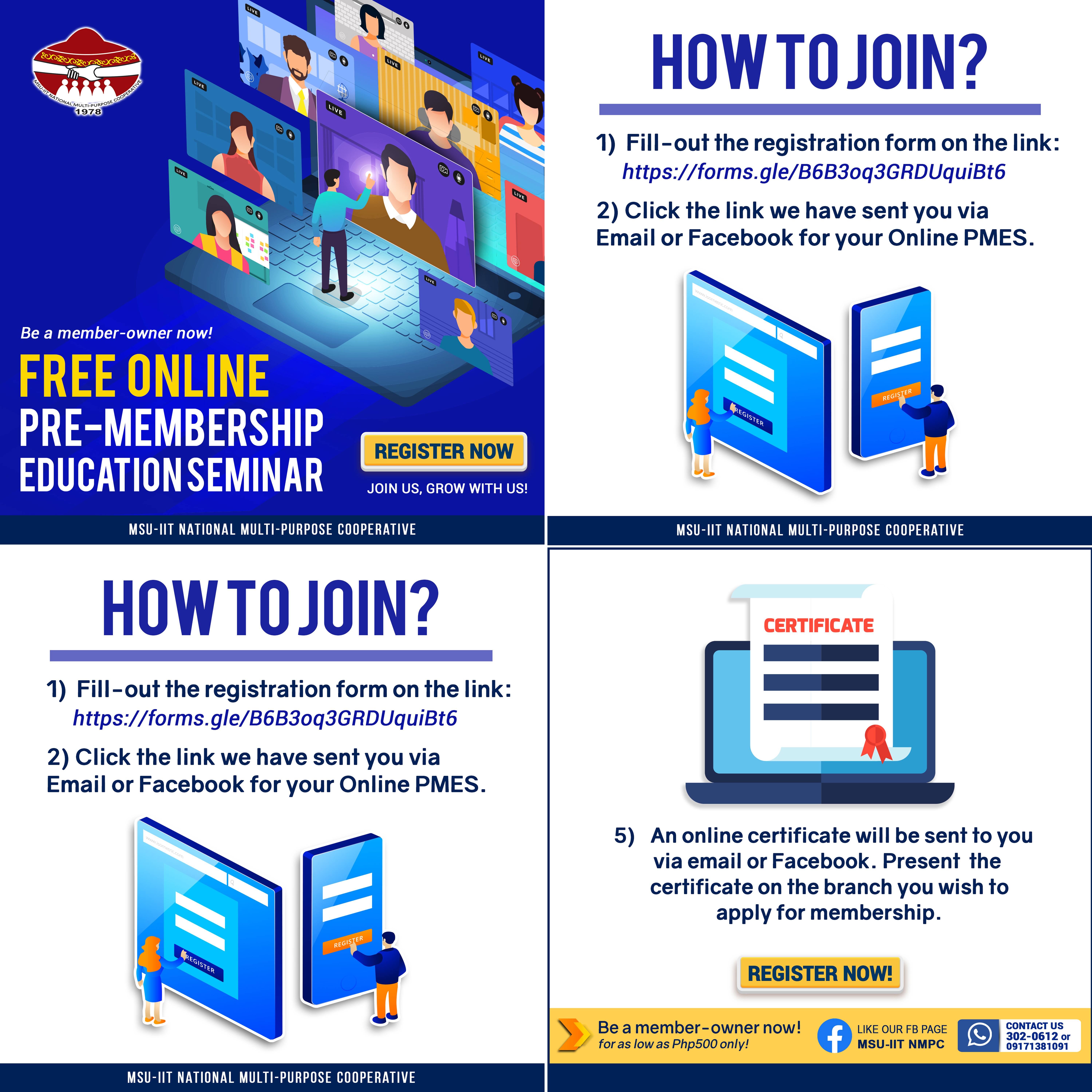 FREE ONLINE PRE-MEMBERSHIP EDUCATION SEMINAR I Register now to be a part of our growing family and enjoy the exclusive benefits of being a member-owner of MSU-IIT National Multi-Purpose Cooperative! For more info, message us or visit our website https://msuiitcoop.org/membership.php
