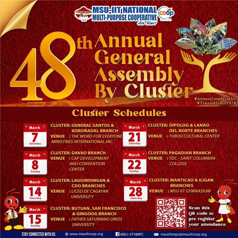 All Members in Good Standing (MIGS) are hereby informed to take note of the respective dates assigned to their clusters. This annual gathering serves as an important platform to review our cooperative’s performance, strengthen transparency, and actively participate in key decisions that shape our future.