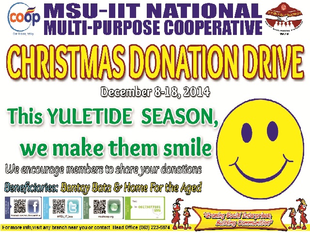 MSU-IIT NMPC initiated an activity called Christmas Donation Drive In which the cooperative is involving its members to donate used items to be given to its beneficiaries. Our donation drive will start TODAY and will end on December 18, 2014.